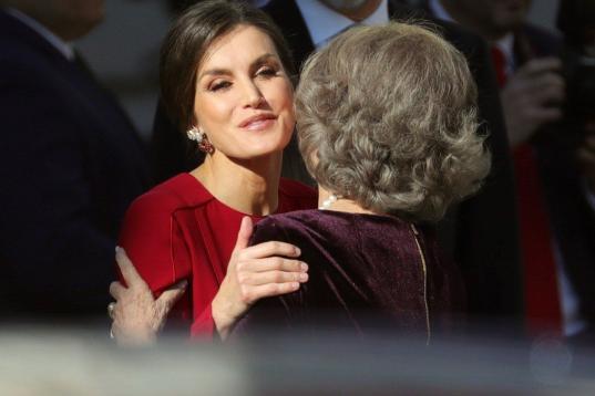 GRAF2572. MADRID, 06/12/2018.- La Reina Letizia y la Reina Sofía, se saludan en el exterior del Congreso de los Diputados, en el que se celebra esta mañana la solemne conmemoración del 40 aniversario de la Constitución, un 6 de diciembre en ...