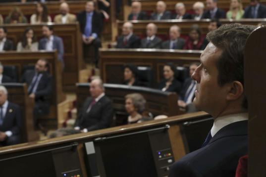 GRAF2662. MADRID, 06/12/2018.- El presidente del PP Pablo Casado, en el hemiciclo del Congreso de los Diputados, durante la celebración esta mañana la solemne conmemoración del 40 aniversario de la Constitución.- EFE/Zipi