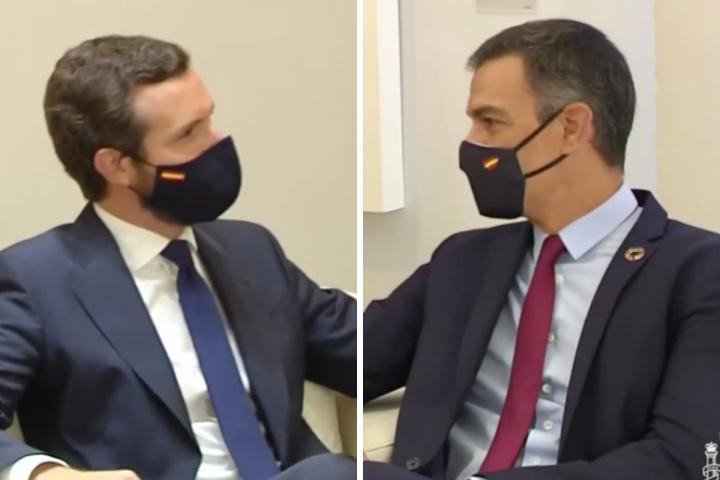 Un codazo para saludarse, posado ante los fotógrafos guardando la distancia de seguridad y sendas mascarillas han marcado la imagen del encuentro que este miércoles han mantenido el presidente del Gobierno, Pedro Sánchez, y el del Partido Popular, Pablo Casado, en La Moncloa.