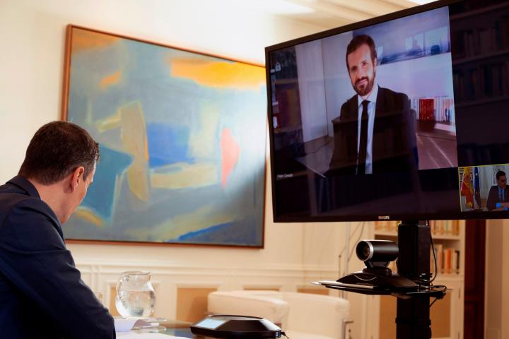Del número 13 de la calle Génova al Palacio de La Moncloa apenas hay cuatro kilómetros y medio. Poco más de diez minutos en coche. Pero la distancia política hasta hoy parecía allende los mares. A las 11 de la mañana conectaba su Mac Pablo Casado y Pedro Sánchez le esperaba al otro lado por videoconferencia. En mitad de la situación más dramática que ha vivido España en décadas.