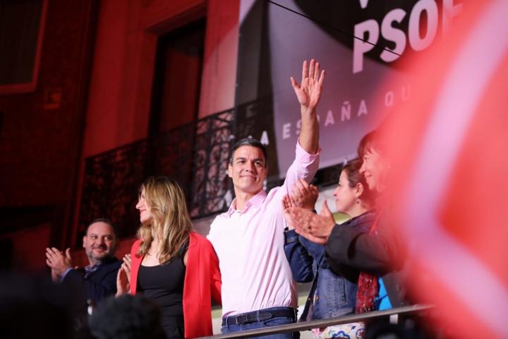 Junto a él, en la plataforma instalada para la ocasión, estaban su mujer, Begoña Gómez; la presidenta del PSOE, Cristina Narbona; la vicesecretaria general, Adriana Lastra; la vicepresidenta del Gobierno en funciones, Carmen Calvo; y el secretario de Organización y coordinador de campaña, José Luis Ábalos.