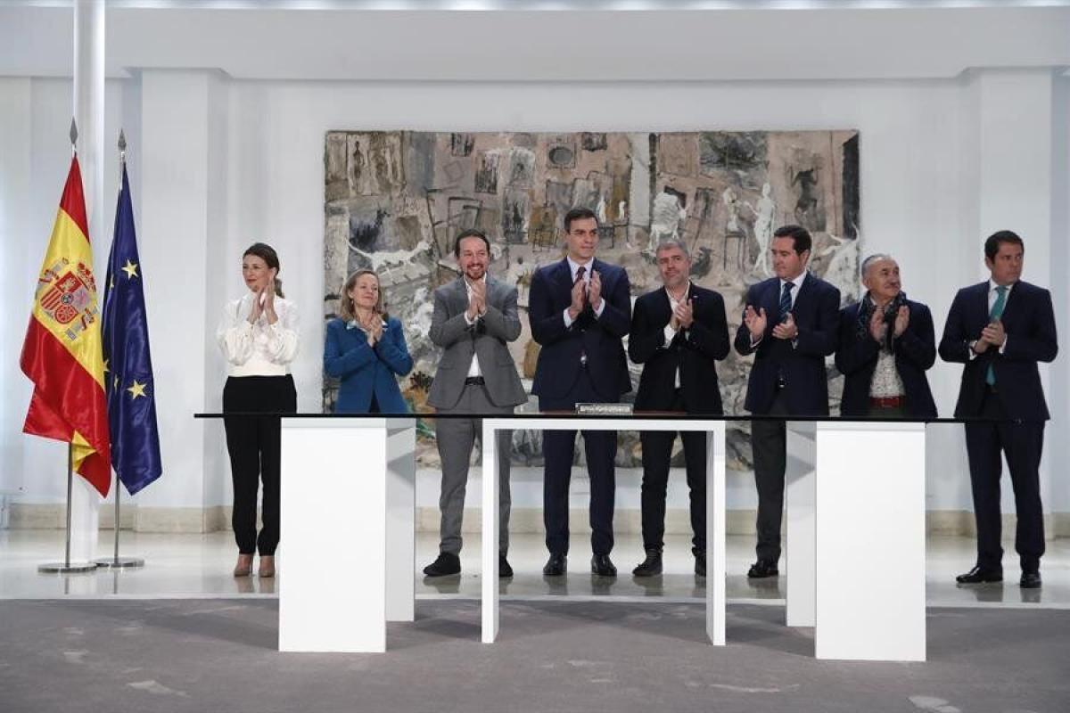 A la firma del acuerdo, que ha tenido lugar a las 11.00 horas en el Palacio de La Moncloa, han asistido el vicepresidente y ministro de Derechos Sociales y Agenda 2030, Pablo Iglesias; la vicepresidenta y ministra de Asuntos Económicos y Transformación Digital, Nadia Calviño, y la ministra de Trabajo y Economía Social, Yolanda Díaz.