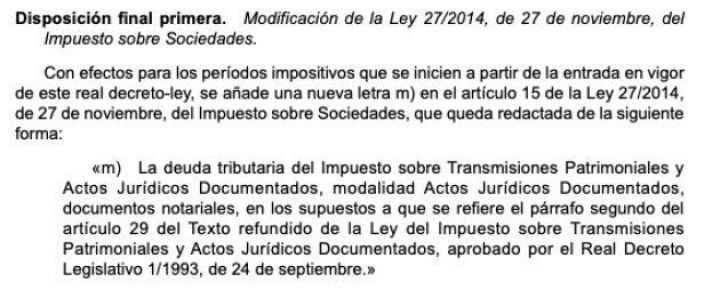 El Gobierno ha publicado este viernes en el Boletín Oficial del Estado (BOE) el real decreto por el que modificará la ley del impuesto sobre actos jurídicos documentados (AJD) para que sea el banco y no el cliente quien pague a partir de este lunes el tributo asociado a las hipotecas. El Ejecutivo también modifica la ley del impuesto de sociedades para impedir que las entidades financieras deducirse este gravamen en el impuesto de sociedades. No obstante, la redacción del cambio legal deja abierta la puerta para que los bancos puedan rebajar su factura tributaria durante este año. Es decir, que las entidades que a partir del lunes carguen con el impuesto podrán deduciíselo en el pago del impuesto de sociedades durante este año.