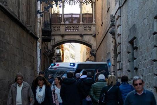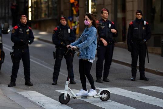 Una joven circula con su patinete en los aledaños de la plaza Sant Jaume, cuyos accesos se ven restringidos por el dispositivo de seguridad desplegado desde primera hora de la mañana ante el Palau de la Generalitat.