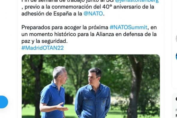 “Fin de semana de trabajo junto a Jens Stoltenberg, previo a la conmemoración del 40º aniversario de la adhesión de España a la OTAN. Preparados para acoger la próxima cumbre de la OTAN, en un momento histórico para la Alianza en defensa de la paz y la seguridad”, ha escrito el presidente del Gobierno.
