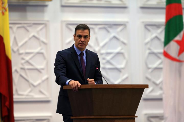 El presidente de gobierno de España, Pedro Sánchez, interviene en una reunión entre representantes comerciales de España y Argelia, el 8 de octubre de 2020, en Argel. (AP Foto/Anis Belghoul)ASSOCIATED PRESS