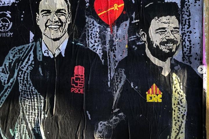Si tanto toma y daca ha generado ríos de tinta y debates de todos los colores, no es de extrañar que también haya inspirado a algún artista, como es el caso de Tvboy, un artista urbano italiano radicado en Barcelona y conocido por sus grafitis en los que suele emparejar a personajes antagónicos -los besos son su especialidad-. Ahora ha realizado un nuevo mural en la capital catalana que, desde esta madrugada, deja ver en la Plaza Sant Jaume a Pedro Sánchez y a Gabriel Rufián juntos de la mano. Los soñadores, ha titulado su obra.
