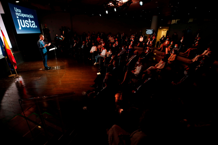 Sánchez ha empezado septiembre con una conferencia en la Casa de América en Madrid ante miembros de su Gobierno, agentes sociales y representantes de la sociedad civil para dar a conocer su planes, que estarán marcados por la recuperación económica, la llegada de los fondos europeos y el hito de la vacunación (España alcanza hoy el 70% de población con dos dosis).