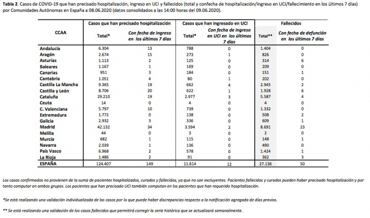 En los siete días recientes han sido 149 los pacientes con coronavirus que han requerido ingreso hospitalario, con datos muy repartidos, estos sí, entre varias zonas (34 en Madrid, 20 en Castilla y León, 19 en Cataluña y Castilla-La Mancha o 15 en Aragón). De ellos, solo 12 han necesitado ser llevados a la UCI, de los cuales, cuatro en Castilla-La Mancha, tres en Cataluña o dos en Madrid.