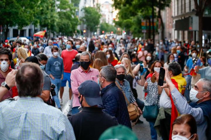 Una multitud de personas se manifesta en contra del Gobierno sin respetar la distancia de seguridad interpersonal. Madrid, 17 de mayo.Óscar J. Barroso/Europa Press via Getty Images