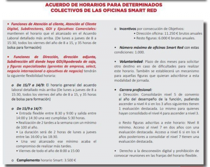 El pacto contempla que 500 oficinas de grandes dimensiones de Santander, conocidas como Smart Red, abran por la tarde a partir del próximo 15 de septiembre. El grupo que preside Ana Botín pretende extender la apertura en horario vespertino a 1.000 oficinas.