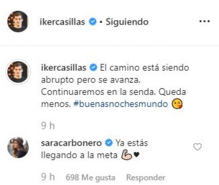 Entre ellos, destaca el que ha escrito su pareja. “Ya estás llegando a la meta”, apuntó Sara Carbonero, junto con el emoticono de un brazo sacando bíceps, que indica ánimos y fuerza, y un corazón.