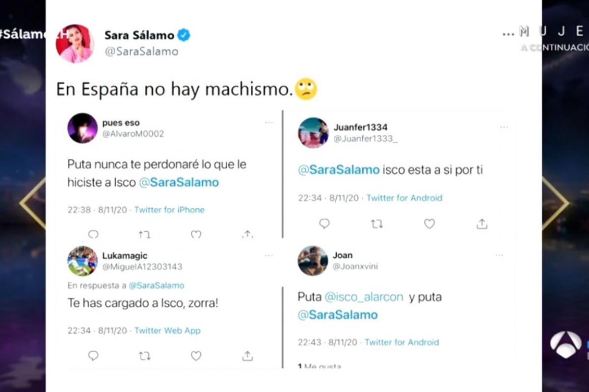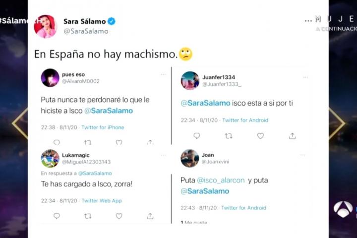 Sálamo agradeció las palabras de Tosar y se resignó ante el uso que se hace de las redes sociales: “Creo que te consta como son. Al final mucha gente juzga el trabajo de una persona y me juzga a mí por el rendimiento que pueda tener mi pareja [el jugador del Real Madrid, Isco Alarcón] o no, es como si yo tengo una secuencia horrible y le van a increpar a él. Es una cosa muy absurda, muy loca, muy antigua y muy machista”.