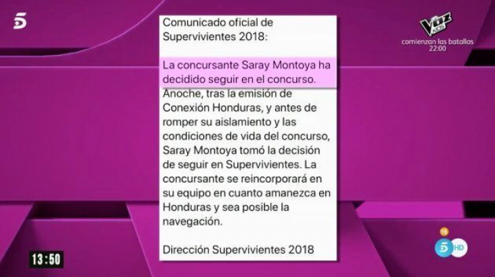 "La concursante Saray Montoya ha decidido seguir en el concurso. Anoche, tras la emisión de Conexión Honduras y antes de romper su aislamiento y las condiciones de vida del concurso, Saray Montoya tomó la decisión de seguir en Supervivientes. La concursante se reincorporará en su equipo en cuanto amanezca en Honduras y sea posible la navegación".