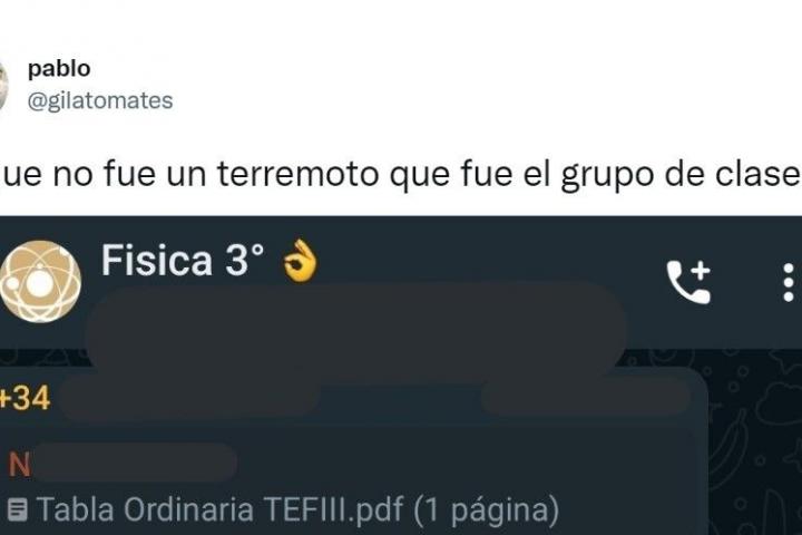 “Ah que no fue un terremoto que fue el grupo de clase”, ha escrito Pablo junto a una captura de pantalla de este fragmento de la conversación.