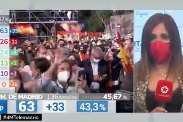 Como no podía ser de otra forma, la calle Génova, lugar en el que se encuentra la sede del PP, se ha convertido en una auténtica fiesta donde cientos de personas se han congregado para celebrar la victoria de Isabel Díaz Ayuso.