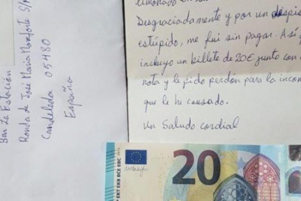 "Por un despiste estúpido me fui sin pagar. Así que le incluyo un billete de 20 euros junto con esta nota y le pido perdón por la inconveniencia que le he causado", se recoge en la misiva.