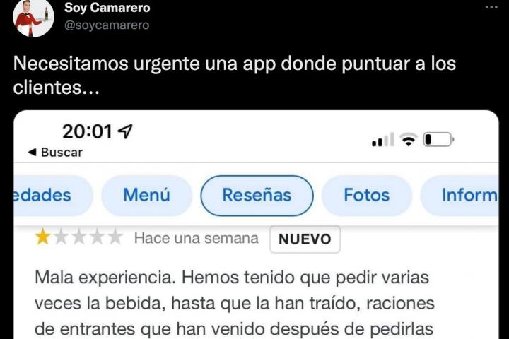 La cuenta Soy Camarero ha compartido una crítica que un usuario ha dejado de un restaurante y la respuesta del local. “Necesitamos urgente una app donde puntuar a los clientes...”, ha escrito junto a la captura de ambos comentarios. La publicación ya supera los 37.000 me gusta en Twitter.