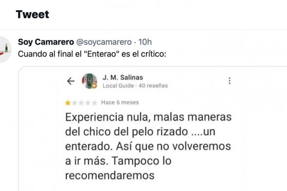La siguiente crítica no entra en ninguno de los dos bandos anteriores. Un comensal ha definido su paso por un restaurante como “experiencia nula” y ha resaltado las “malas maneras del chico del pelo rizado” al que ha definido como “un enterado”.