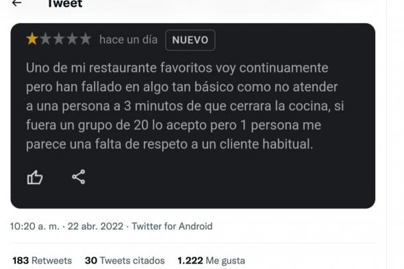 “Uno de mis restaurantes favoritos, voy continuamente pero me han fallado en algo tan básico como no atender a una persona a tres minutos de que cerrara la cocina. Si fuera un grupo de 20 lo acepto, pero una persona me parece una falta de respeto a un cliente habitual”, ha dicho el autor de la reseña, que ha dejado una estrella.