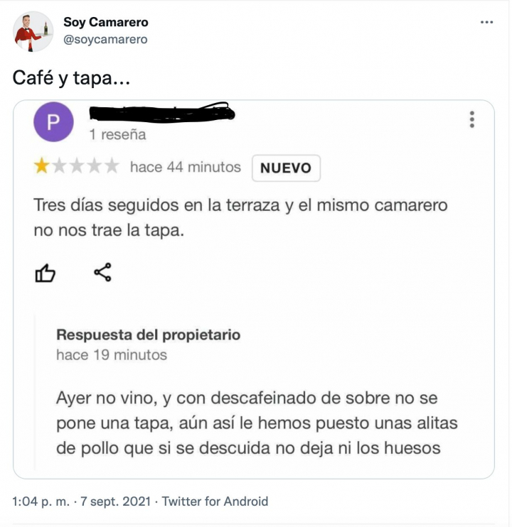“Ayer no vino y con el descafeinado de sobre no se pone tapa. Aún así le hemos puesto unas alitas de pollo que si se descuida no deja ni los huesos”, ha replicado el dueño del negocio.