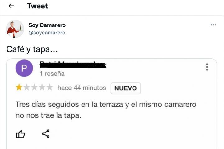 “Tres días seguidos en la terraza y el mismo camarero no nos trae tapa”, se ha quejado un comensal, que como siempre en estos casos le ha plantado una estrella en Google, siendo el máximo cinco.