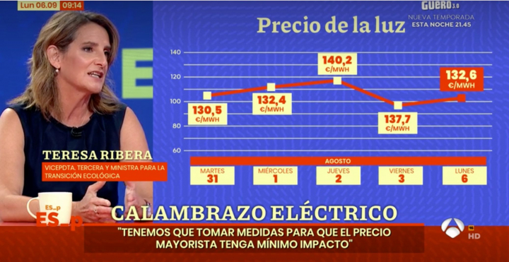 Pero hay algo, además de las palabras de Ribera, que ha llamado la atención en redes sociales. En plena entrevista ha aparecido de fondo una gráfica en la que se plasmaba el cambio del precio de la energía en los últimos días. Lo llamativo de esa gráfica es que, como han visto muchos usuarios, está mal.