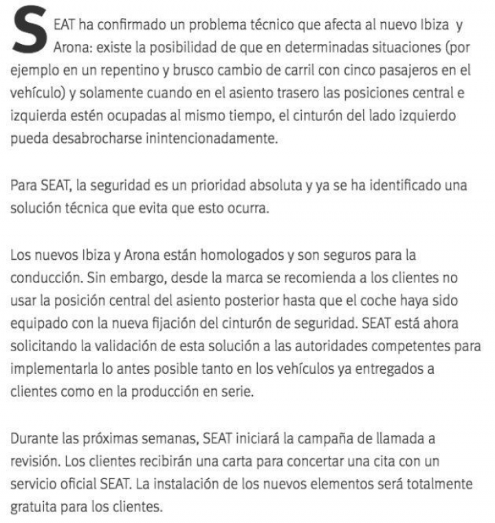 La misma fórmula ha utilizado Seat en su comunicado: "Los nuevos Ibiza y Arona están homologados y son seguros para la conducción".