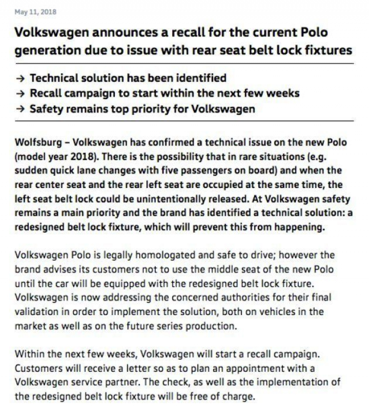 "Volkswagen Polo está homologado legalmente y es seguro para conducir, pero la marca aconseja a sus clientes no usar el asiento central trasero hasta que el automóvil sea equipado con el nuevo seguro del cinturón", señala la marca en un comunicado.