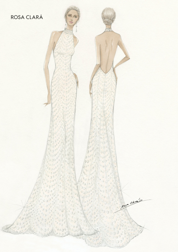 “El escote halter, sensual y elegante, insinúa y combina a la perfección con la gran espalda abierta donde enfatiza el poder de la sensualidad femenina. El vestido se cierra y se eleva con un sofisticado arrastre, mostrando así una delicada y elegante silueta”, añaden.