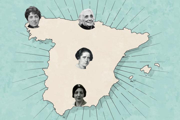 Mapa de destinos natales de mujeres históricas de España. Rosalía de Castro (Padrón, A Coruña), Dolores Ibárruri 'La Pasionaria' (Gallarta, Bizkaia), Clara Campoamor (Madrid) y María Zambrano (Vélez Málaga, Málaga).Getty Images/Wikipedia
