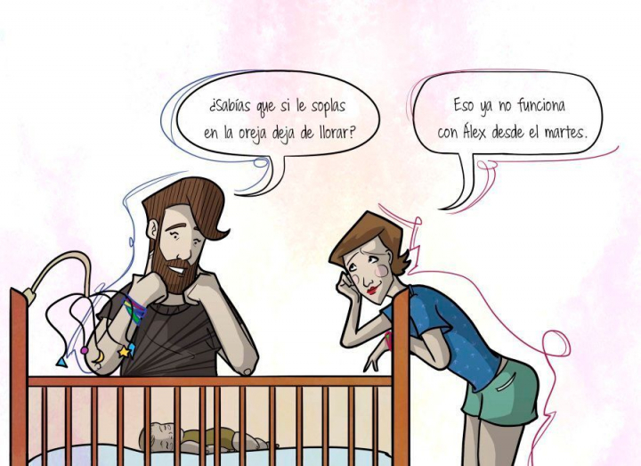 En el cómic incluye esos diálogos con cuñados, amigos, conocidos que saben mucho más de la paternidad que uno mismo, aunque no hayan tenido nunca un bebé en sus brazos. Los llama "opinólogos". También incorpora los puntos de vista de su mujer, Ari.