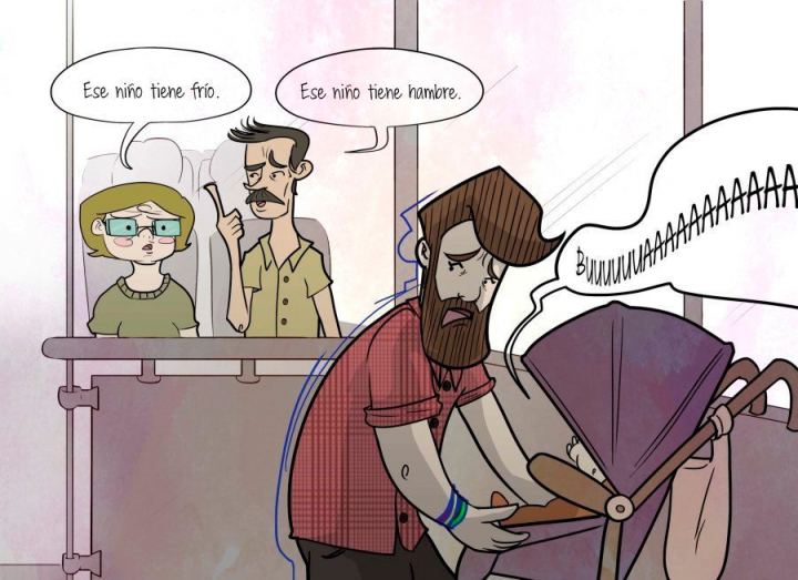 Esas personas que te ponen en alerta en cuanto tienes al pequeño en brazos son las mismas que saben mejor que tú qué es lo que le pasa cuando llora. Si no que se lo digan al autor del cómic, que como todas estas viñetas, vivió estas experiencia en mi primera persona. "Me subí en el autobús y vi que cuando Álex empezó a llorar, dos personas me dijeron 'tiene frío, tiene hambre'. No les quise contestar porque mi terapia es el cómic así que lo apunté en el móvil y creé esta viñeta", añade.