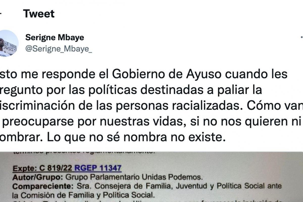 El diputado de Podemos en la Asamblea de Madrid Serigne Mbaye ha mostrado su indignación en Twitter con el gobierno de Isabel Díaz Ayuso por la respuesta que le han dado cuando ha usado en un texto la palabra “racializadas”.