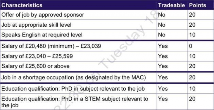 Para entrar a Reino Unido, cada migrante debe cumplir los tres primeros elementos de la tabla, que sumarán hasta 50 puntos: una oferta de trabajo de una empresa validada por el Ministerio del Interior (20 puntos), un trabajo cualificado (20 puntos) y saber hablar el idioma con un nivel apropiado para el puesto (10 puntos).