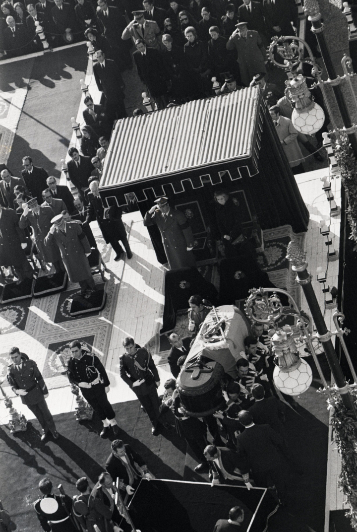 El cortejo avanza por la explanada y, ya en los últimos tramos para entrar en la basílica, portan a hombros el féretro el marqués de Villaverde, el duque de Cádiz y ayudantes de Franco de los tres ejércitos.