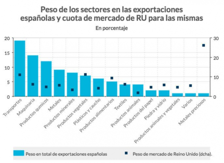 Trabajadores de aquí y pensionistas de allí, vehículos, trenes, aviones y frutas, verduras, finanzas de aquí, coches y combustibles de allí, turistas aquí y allí ... Reino Unido es el cuarto mercado más importante para las exportaciones de productos españoles, hasta un 7,3% del total de lo que se vende fuera. España importa a su vez coches (686,4 millones de euros), combustibles y aceites minerales (666,6 millones de euros) y productos farmacéuticos (250 millones de euros), entre otros.