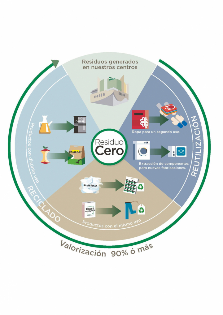 Para el departamento de medioambiente de El Corte Inglés, conseguir el objetivo Residuo Cero significa evitar que toda la basura termine en el vertedero e instaurar una pirámide en la que lo más importante es reutilizar todo aquello que se pueda. Después, reciclar. Por último, valorizar dándole una segunda vida al todo o a una parte. Y si ninguna es posible, entonces la eliminación controlada.