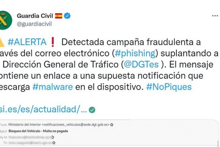 “Detectada campaña fraudulenta a través del correo electrónico (phishing) suplantando a la Dirección General de Tráfico”, ha informado la Guardia Civil.