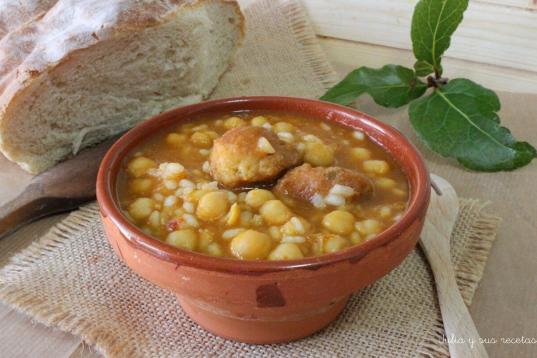 ▶️ Ingredientes: garbanzos, cebolla, ajo, pimiento verde y rojo, tomates maduros, laurel, comino, aceite de oliva, agua y arroz. ▶️ Encuentra aquí la receta completa.
