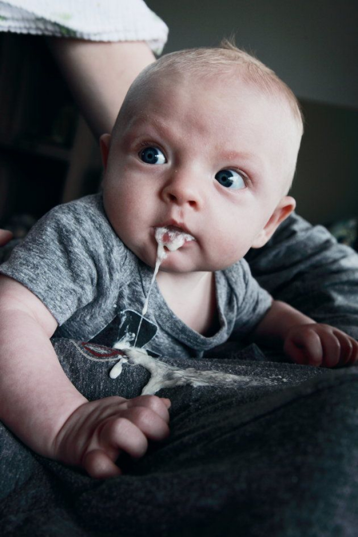 Para vuestra información, los bebés vomitan. A veces lo hacen de forma mucho más despreocupada que los adultos, la clase de vómito que simplemente les sale y siguen a lo suyo como si nada.