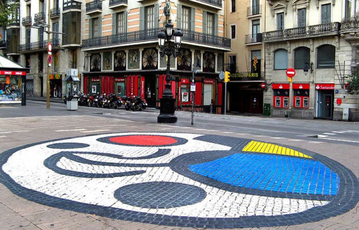 Cuando pasees por La Rambla, haz una parada en la plaza de la Boquería y fíjate en el suelo, verás una obra de Joan Miró. Es un círculo irregular de color blanco, negro, azul, rojo y amarillo que los transeúntes pisan diariamente, pues así lo pidió expresamente el artista. Se trata de un pavimento diferente al del resto de la plaza, compuesto de losetas de terrazo, creadas en 1976 con cemento blanco teñido con vidrio. Esta obra fue concebida por Miró como saludo a los viajeros que llegaban por el mar.