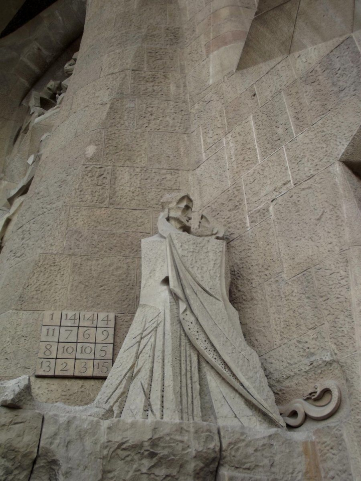 Junto a la escultura del Beso de Judas ubicada en la fachada de la Pasión de la Sagrada Familia, existe un misterioso enigma numerológico. Se trata de un criptograma de 16 cifras que permite hacer 310 combinaciones diferentes que suman siempre 33, la edad de Cristo en el momento de su muerte. Observarás que faltan los números 12 y el 16, pero que el 10 y el 14 están repetidos. Esto tiene una explicación matemática: no se pueden lograr números impares, como el 33, sin repetir la misma cifra.