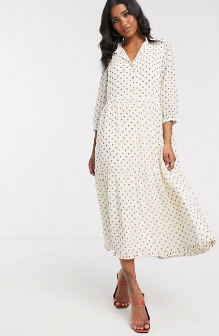 Un vestido camisero es un básico que merece la pena tener siempre en el armario. Este, con lunares en tono caramelo y falda holgada, es perfecto para el otoño. En Asos, por 75,99 euros.