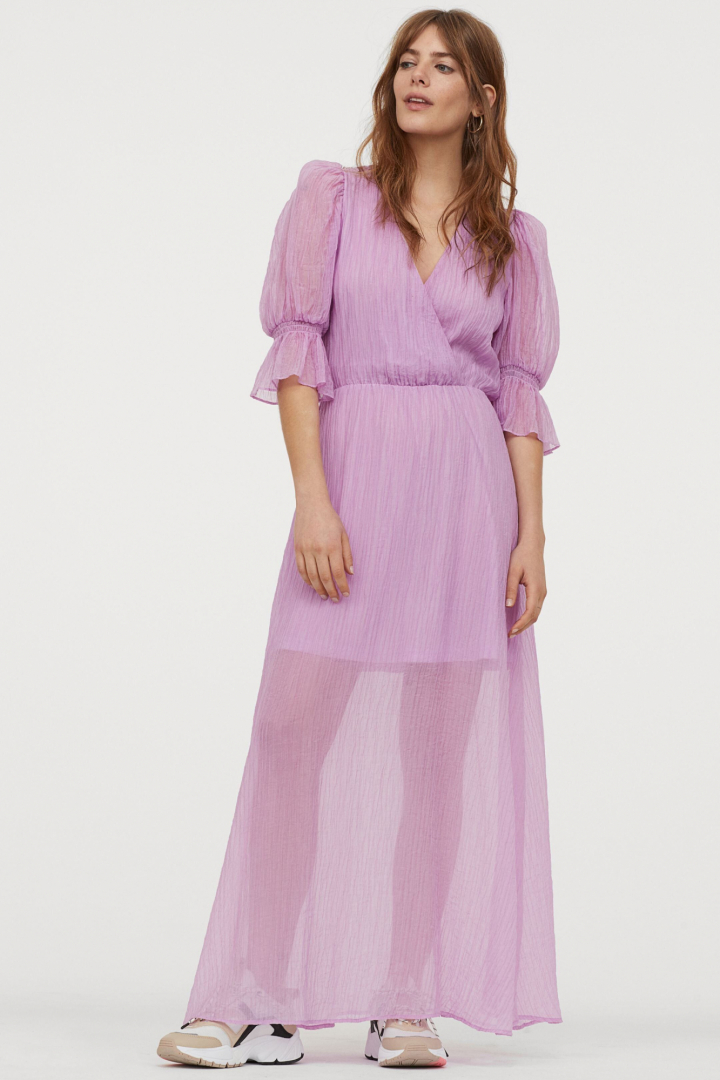 Este vestido lleva varias semanas siendo la estrella de Instagram. Su popularidad viene porque fue una de las prendas del desfile virtual en el que H&M presentó sus novedades. Es un diseño de 39,99 euros en color malva, de escote cruzado y estilo romántico fabricado con lyocell, un tejido sostenible. La firma propone combinarlo con deportivas, pero también es una prenda ideal para llevar con sandalia plana.