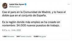“Es la región donde más empleo se ha creado en noviembre: 34.000 nuevos puestos de trabajo”, puso en valor la presidenta madrileña.