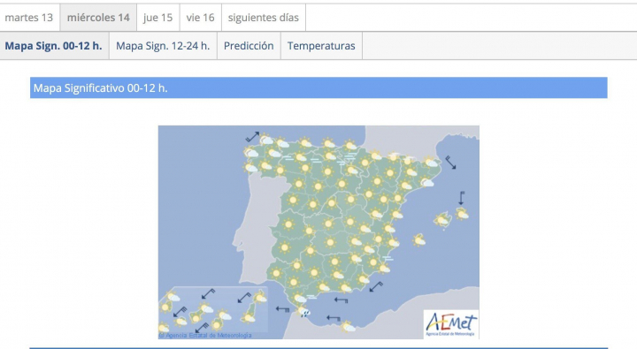 Se prevé ambiente soleado en general, aunque existirá riesgo de algún chubasco tormentoso en el interior de Cataluña durante el jueves por la tarde y el viernes. Los mapas de nubosidad auguran días algo más grises en zonas del Cantábrico, litoral mediterráneo, norte de Canarias y por la tarde en algunas comarcas del interior peninsular.