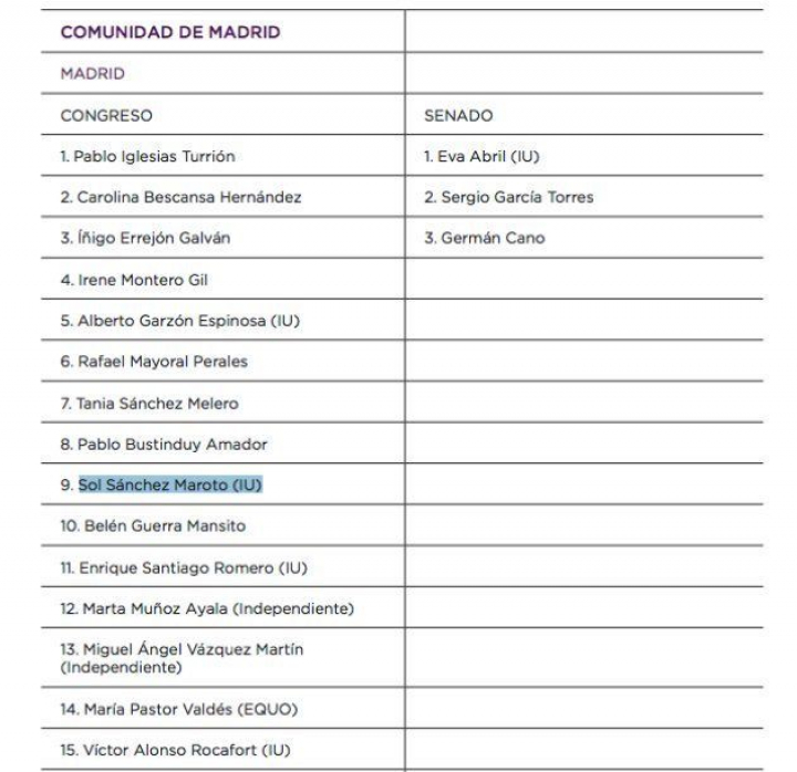 La coalición Unidos Podemos logró 8 diputados por la circunscripción de Madrid en las últimas elecciones generales, celebradas en junio de 2016. La renuncia de Errejón, que se presentó como número 3 detrás de Pablo Iglesias y Carolina Bescansa, supone la entrada del número 9. Este puesto lo ocupó Sol Sánchez, de IU.