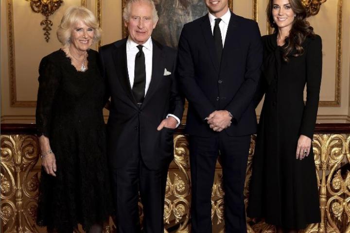 El Palacio de Buckingham ha publicado una nueva foto oficial de la Casa Real Británica en la que Carlos III y su esposa Camilla posan junto al príncipe Guillermo y Kate Middleton. Todos ellos aparecen vestidos de negro y sonriendo a la cámara.