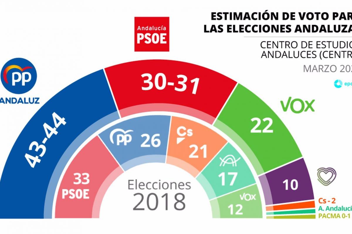 El sondeo refleja que el PP-A y Vox mejorarían en votos respecto a los comicios de diciembre de 2018, al obtener un 13,3 y 8% más, respectivamente, mientras que el PSOE-A perdería un 2,6% de sufragios respecto a la última cita autonómica, y Cs caería un 14%.